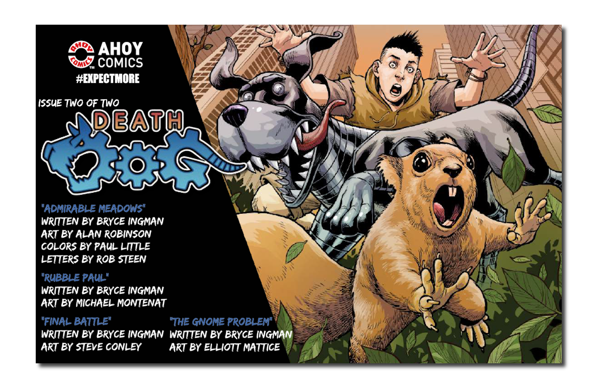 On Wednesday, December 3rd, AHOY Comics is set to release DEATH DOG #2 (of 2) – the second and final issue in the touching tale of a terrifying future from the deranged minds of writer Bryce Ingman (MY BAD) and Alan Robinson (New Fantastic Four) about Wyatt, a near-future street kid, and Dog, a police robot-dog programmed to execute suspects on the street.