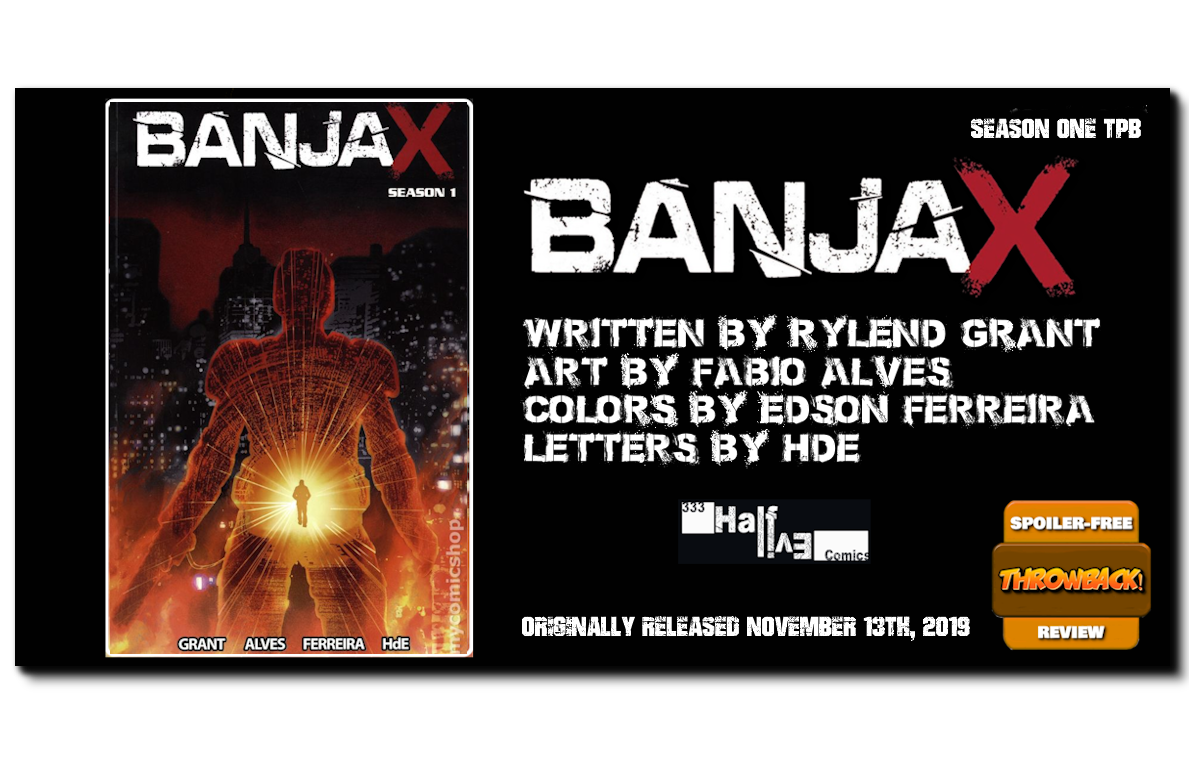 And that got me thinking… I should re-publish my spoiler-free comic book reviews I conducted from over six years ago! The review was published at PopCultHQ – a pop culture media site I worked at for 10+ years. I had received an advance review copy of BANJAX Season One TPB from Action Lab Entertainment‘s Danger Zone imprint. The trade paperback collected the four-issue miniseries and was originally released on Wednesday, November 13th, 2019. The creative team for this collected edition featured writing from Rylend Grant, art from Fábio Alves, colors by Edson Ferreira, and lettering from HdE.